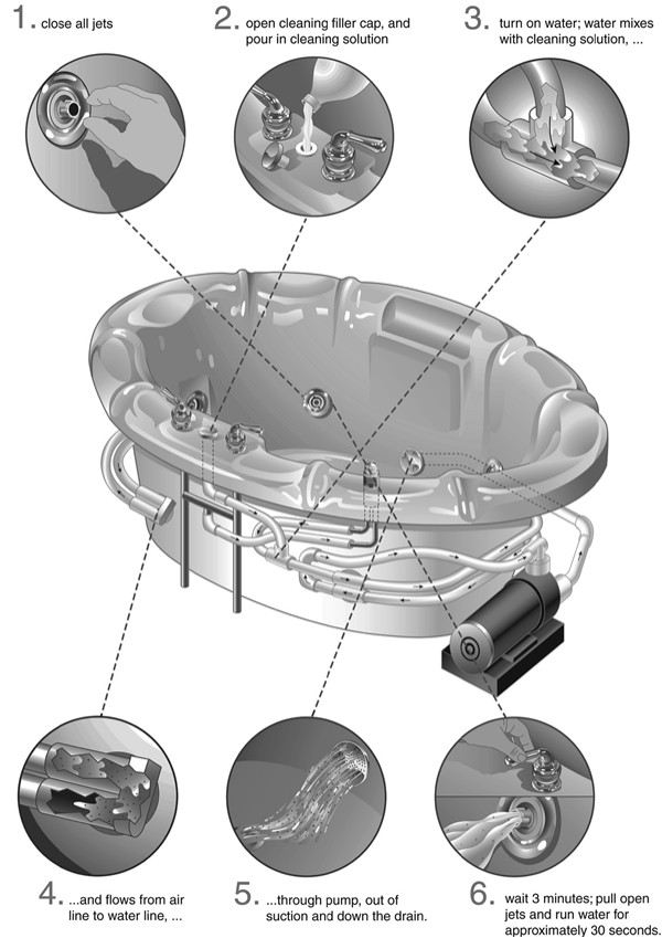 This system cleans the internal plumbing components of the main whirlpool system, including water lines and air lines, adjustable point-massage jets and pump. Concentrated detergent is back flushed through the entire plumbing harness one line at a time. All this is achieved in fewer than 5 minutes and with less than 10 gallons of water.